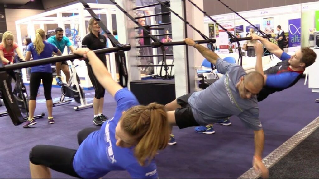 The user holds the training bar while working through the straps, creating a safe but intentionally unstable axis of movement that develops full-body stabilization.